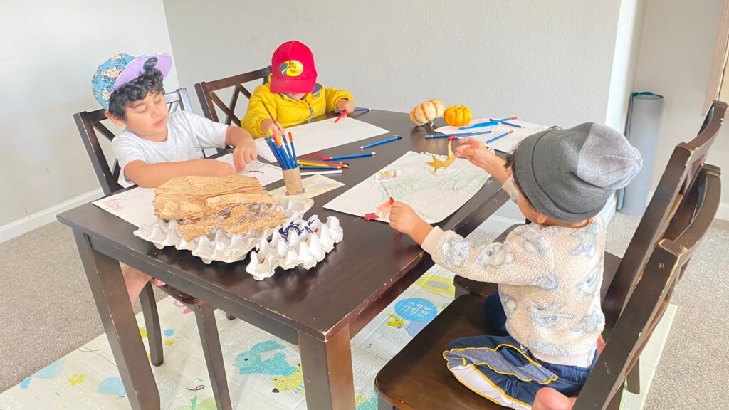 Luego comenzamos a preparar material en casa con ritmos, cambios de hábitos, tiempos de sueño, saber cómo nos sentíamos con los cambios del entorno fue clave, conocer temperamentos individuales. También comencé a entender mucho más sobre la pedagogía Waldorf, Comenzamos a trabajar con un curriculum maravilloso de ‘Wodergarten’ Early Childhood . En Waldorf jardín de infantes se trabaja de 3 a 6 años, increíble como este curriculum que además se divide por estaciones, nos llevó de la mano durante todo el año escolar, junto con nuestra agenda de trabajo ‘Wodergarten 2024-2025’ donde podía detallar al máximo todo lo que debíamos hacer cada día, desde preparar nuestros alimentos hasta hacer las actividades diarias asignadas y así sincronizar nuestro día en medio de actividades de inhalación y exhalación. Un curriculum supremamente amable y de un alcance creativo y amoroso impresionante con lo cual fue hermoso desplegar el trabajo en simultaneo para los tres niños.